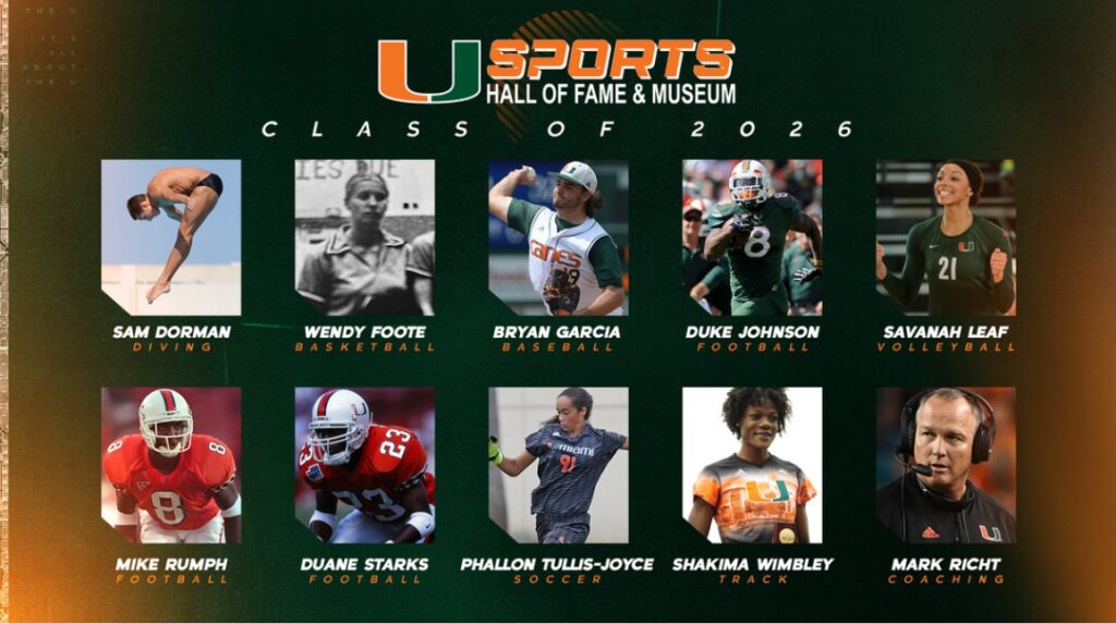 Celebrate the UM Sports Hall of Fame Class of 2026 at the annual Induction Banquet on April 23, 2026 at the Watsco Center. Cocktails begin at 6 PM, followed by dinner at 7 PM as we celebrate and honor this year’s exceptional inductees.